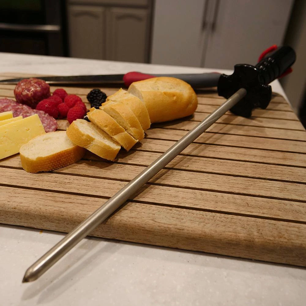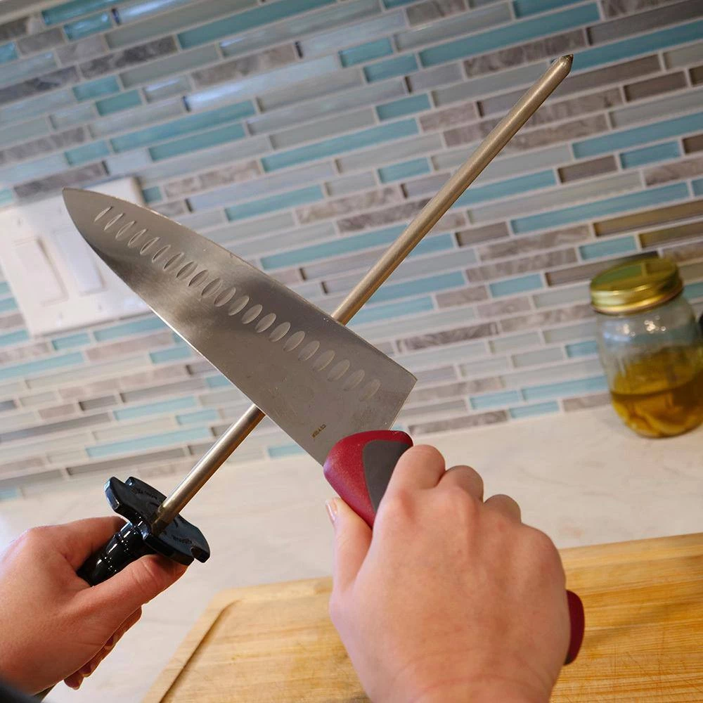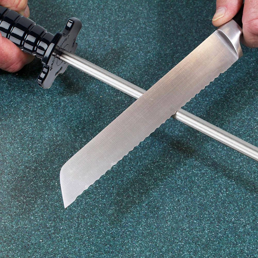 12 in. Diamond Steel. Fast honing diamond surface with the realigning function and convenience of traditional butcher’s steel. A diamond sharpening rod with sanitary black plastic handle with large guard and color coded ring for easy grit designation and hang-up. Fine diamond (25 mic/600 mesh) for a razor sharp edge. Rod: 12 in. x 0.375 in. (304 mm x 10 mm)Sharpening with diamonds is fast and easy. No messy oils needed sharpen dry or with water. Durable construction will provide years of consistent performance and reliable service. For proper tool maintenance, woodworkers, chefs and other professionals rely on the superior quality and versatility of DMT products.