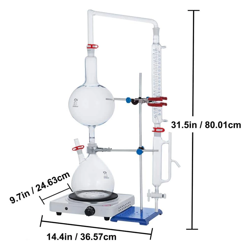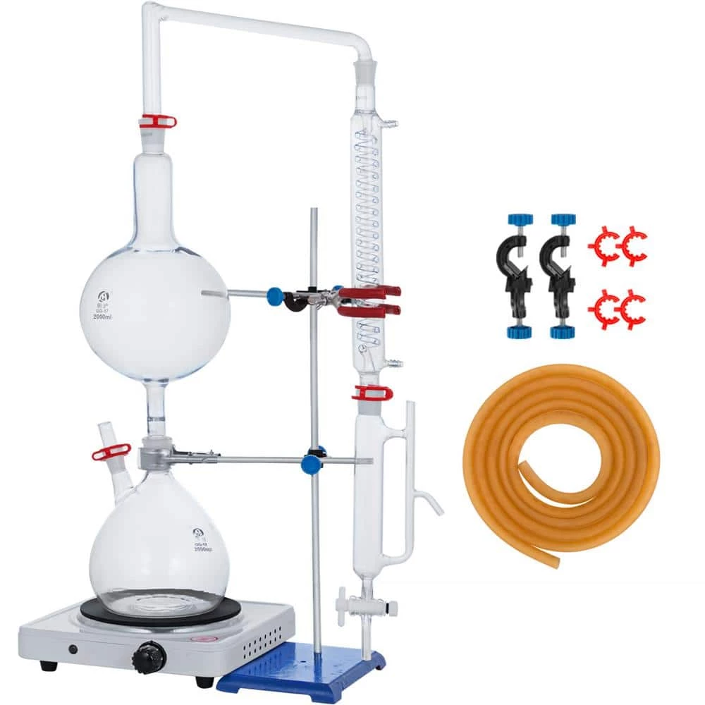 The VEVOR 2.11 Qt. Essential Oil Distillation Kit This is a professional set, based on steam distillation principle to operate, which will increase essential oil rate, produce higher purity than traditional way. It is quick to install, easy to use and safe with high quality Borosilicate Glassware. You can freely DIY essential oil and process materials, like: lemon, rose, lavender, tea tree etc. Good product you cannot miss!
