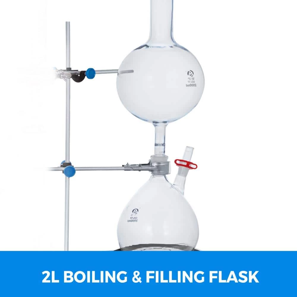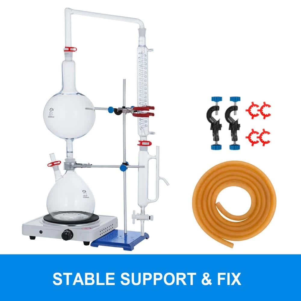 - Professional kit-including: 2 L flask, base, clamp, connector, 1 M silicone tube, condenser, receiver/separation funnel, glass stopper, can meet all your needs. Good airtightness, the glass plug does not leak water or steam