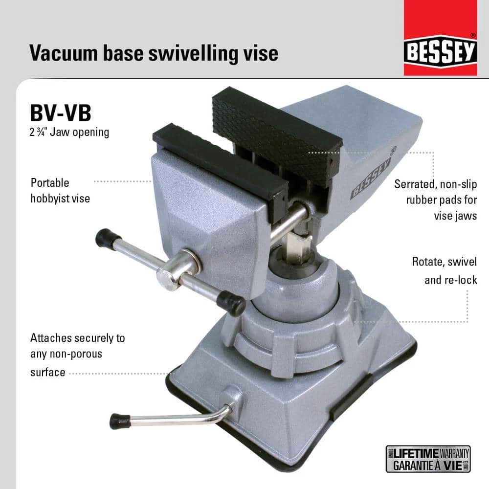 BESSEY vacuum base vises are light in weight and easy to move around. These light-duty vises are made from high quality components for years of dependable service. Vacuum base grips firmly to glass, metal, laminate, fiberglass or any non-porous smooth surface.
