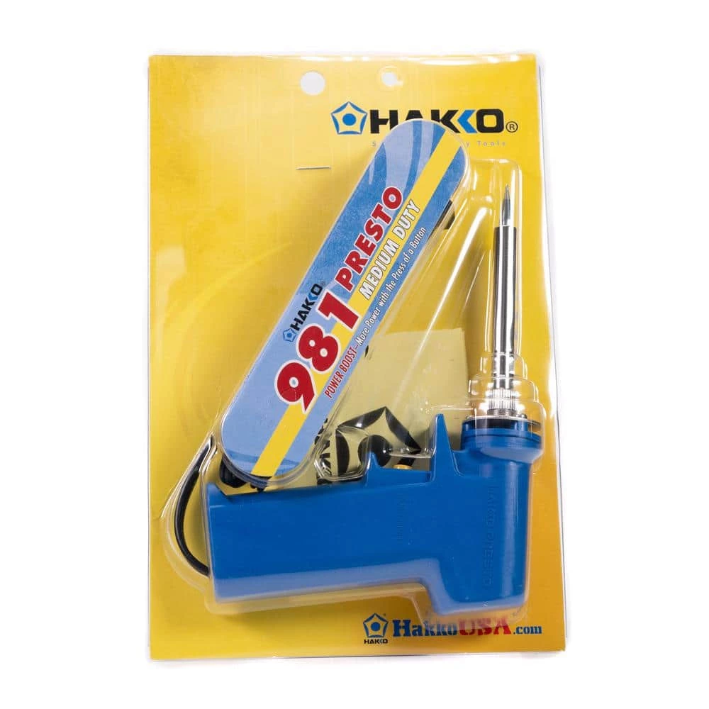 The Hakko dual-power soldering iron is a light-duty soldering iron with optional additional power. The user can increase the power from 20-watts to 130-watts with the press of a button. This iron is ideal for soldering applications that may need a boost of power for occasional heavy-duty soldering application.