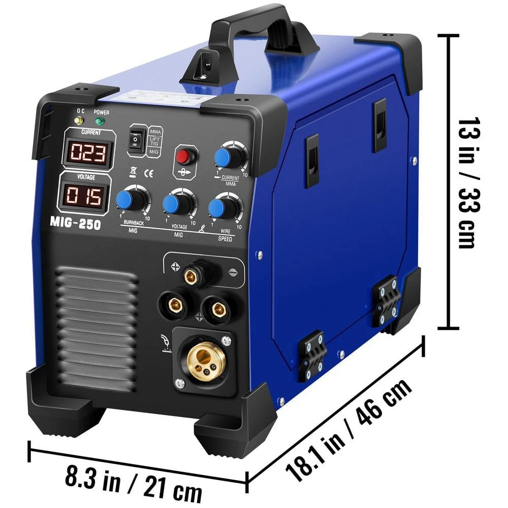 - Specification Welder Type MIG/MMA/TIG, Voltage 110/220-Volt, Current Range 50 to 250 Amp, Protection Degree IP21S, Rated Input Power 5.6KVA, Wire Speed 2.2 to 12 m/min, Wire Thickness 0.024 in. and 0.031 in. and 0.039 in., Wire Weight 2.2/11 lbs., Product Dimensions 18.1 in. L x 8.3 in. W x 13 in. H