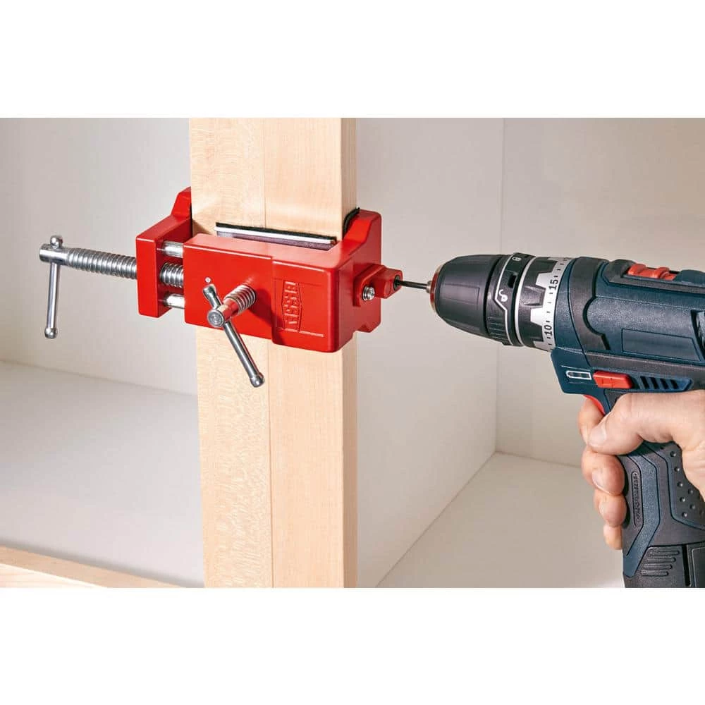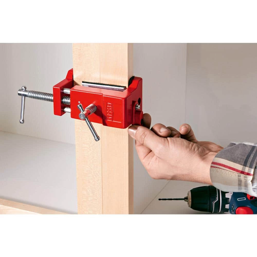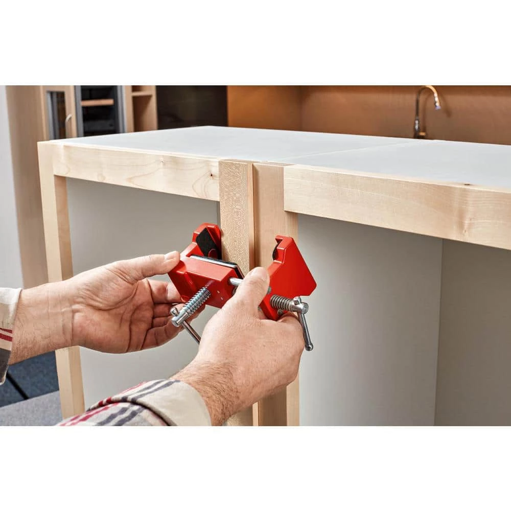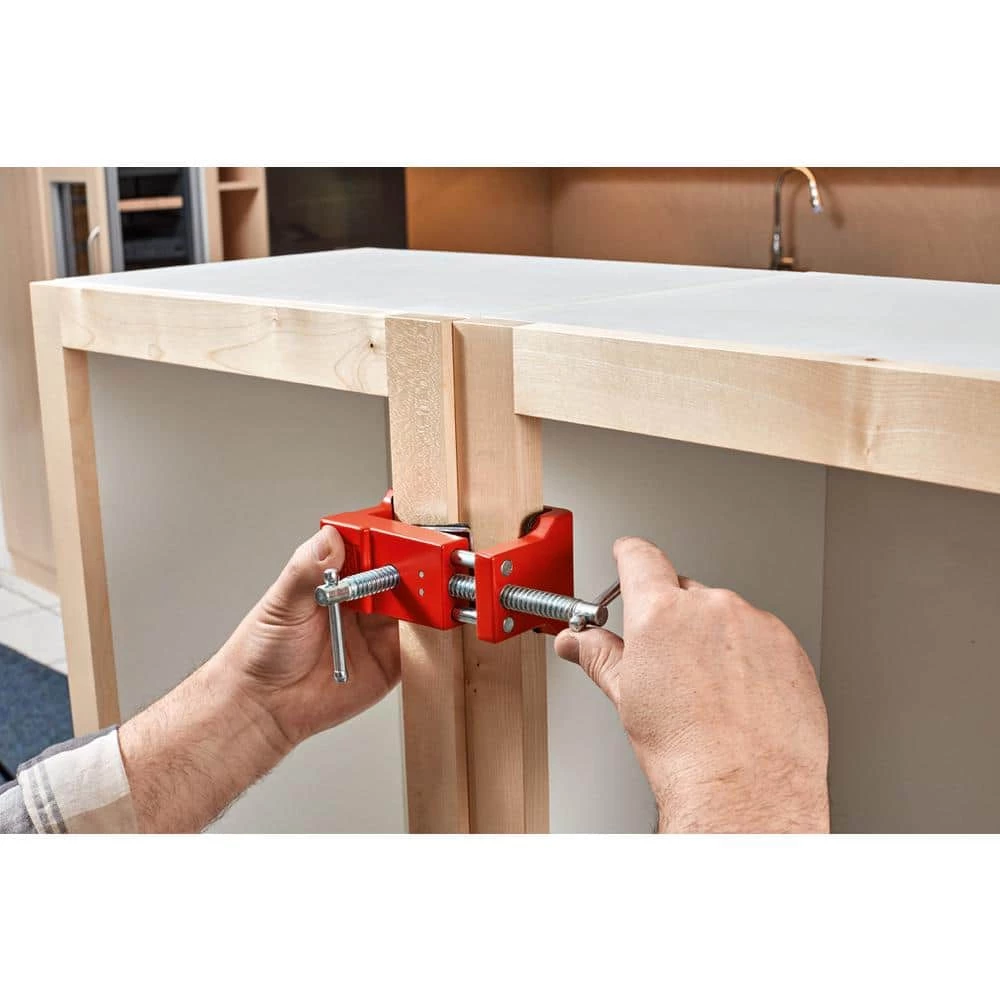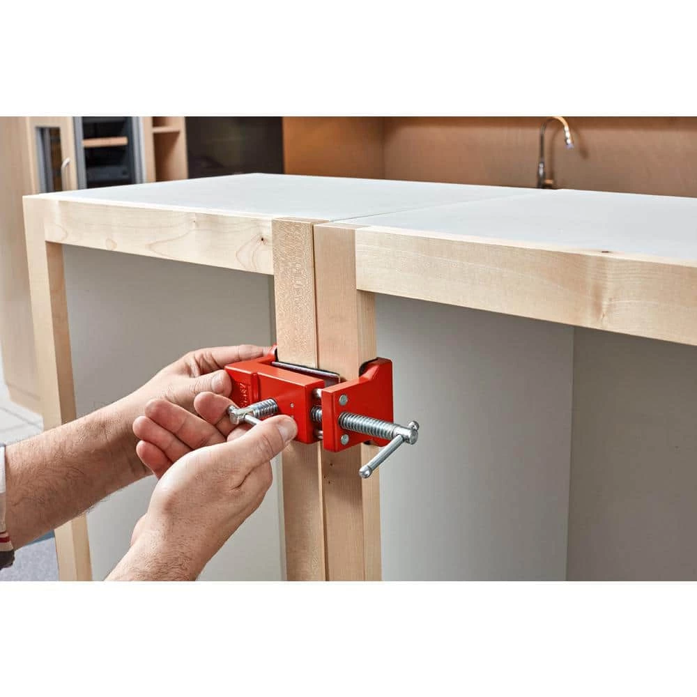 The BESSEY cabinetry clamp is designed to combine the multiple steps of face frame cabinet installation into one easy process. It works on stiles 1-1/2 in. to 2 in. and up to 1-1/2 in. thick (each). Face frame stiles can be tightened, aligned, pre-drilled and fastened while the clamp is in place. The clamp holds the individual cabinet edges together while also keeping the faces along the joint flush. There is an integrated pilot-hole drilling guide on one end. The guide flips out of the way so you can drive screws to connect the cabinets without removing or repositioning the clamp. Professional quality installation is achieved at a fraction of the time compared to the use of more conventional clamps.
