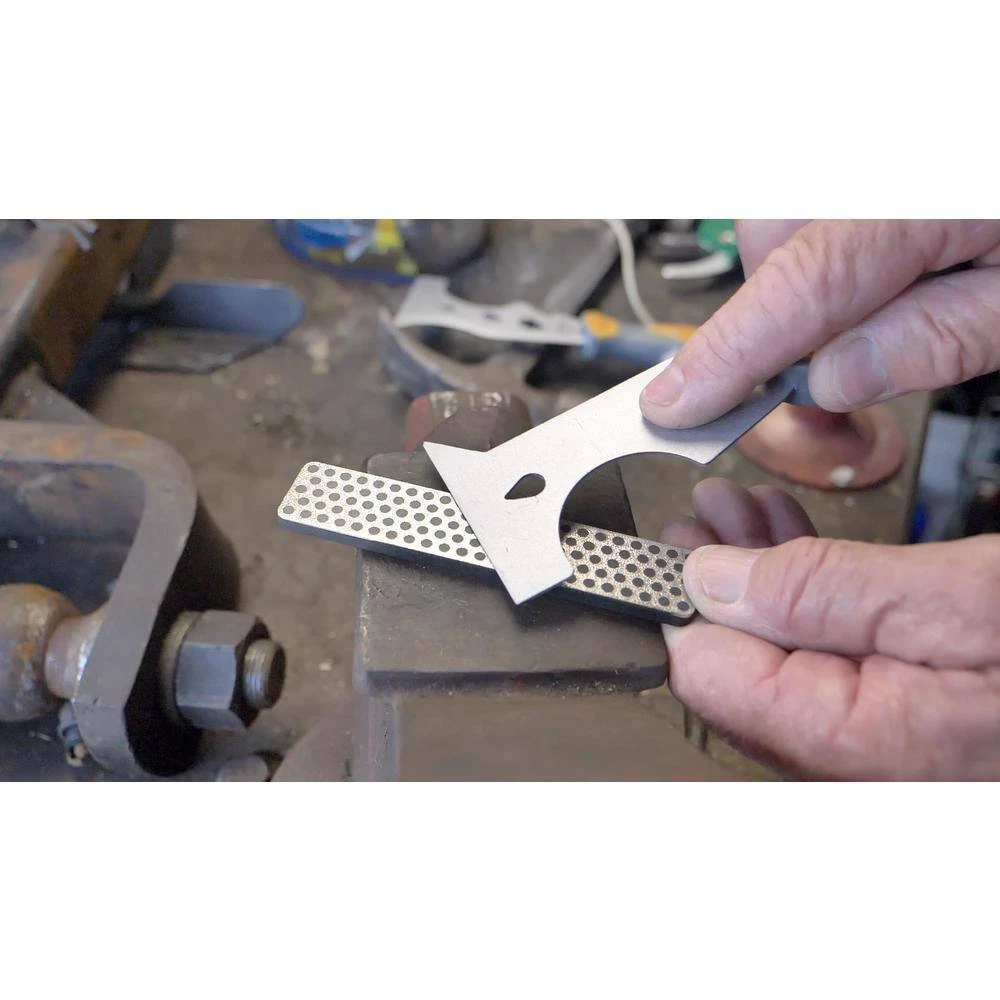 Convenient pocket model 4 Diamond Whetstone sharpener with protective leather sheath for easy access to a variety of sharpening, honing or filing needs. Extra-Coarse diamond (60 mic/220 mesh) when significant removal of material is needed for damaged edges. Size: 4-1/3 in. x 7/8 in. x 3/16 in. Sharpening with diamonds is fast and easy. No messy oils needed sharpen dry or with water. Durable construction will provide years of consistent performance and reliable service. For proper tool maintenance, woodworkers, chefs and other professionals rely on the superior quality and versatility of DMT products.