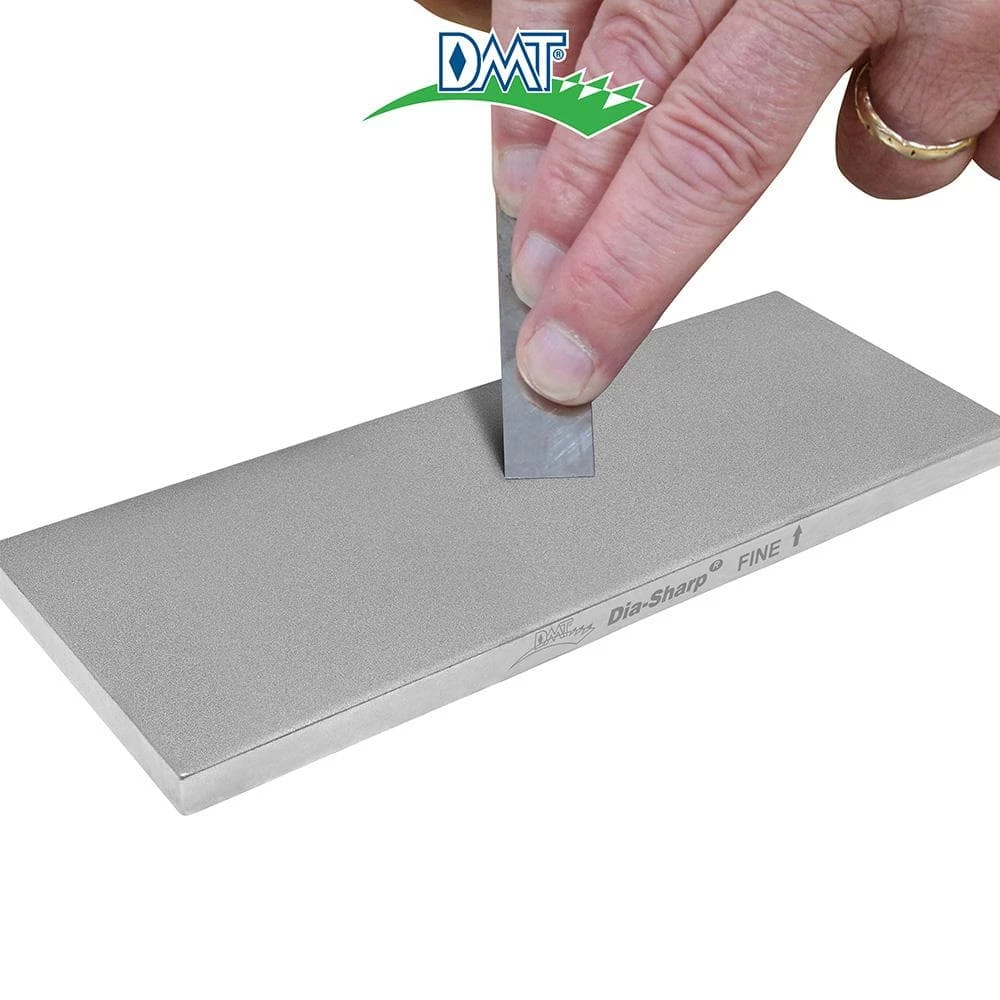 USA made Dia-Sharp Bench Stone in fine diamond is precisely engineered and guaranteed not to hollow or groove, essential in assuring even sharpening and will remain flat, unlike water stones. This 8 in. x 3 in. x 3/8 in. bench stone will take care of a variety of blade lengths as well as affording a keen edge on small contact areas and pointed tools. Easy to use, you can forget those messy oils that are required with other sharpeners; the diamond surface allows you to sharpen dry or with water. DMT employs a proprietary process resulting in a micronized monocrystalline diamond that covers evenly across the stone for a hard wearing surface guaranteed to provide consistent, efficient sharpening for years to come. Enjoy faster sharpening: 5 or 6 strokes per edge versus 30 on a conventional abrasive. This allows you to spend less time sharpening edges and more time using them. Sharpen with fine diamond (25 micron / 600 mesh) for a razor sharp edge.