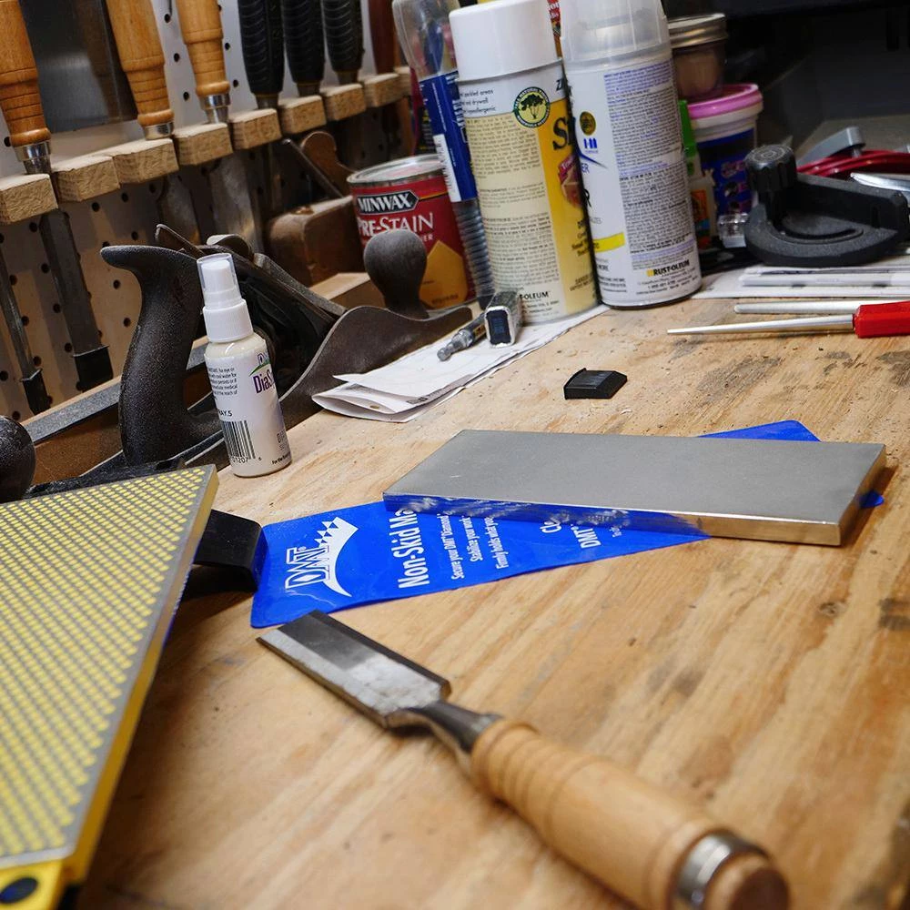 Guaranteed not to hollow or groove, DMTs precisely engineered Dia-Sharp Bench Stone with continuous diamond surface assures consistent, even sharpening every time. The 8 in. L is great for both long and short knives providing cutting edge performance for a quick, keen edge on small contact areas and pointed tools. Extra-Coarse diamond (60 mic/220) when significant removal of material is needed for damaged edges. Includes non-skid rubber feet. Diamond grit clearly marked on side of stone. Sharpening with diamonds is fast and easy. No messy oils needed sharpen dry or with water. Durable construction will provide years of consistent performance and reliable service. For proper tool maintenance, woodworkers, chefs and other professionals rely on the superior quality and versatility of DMT products.