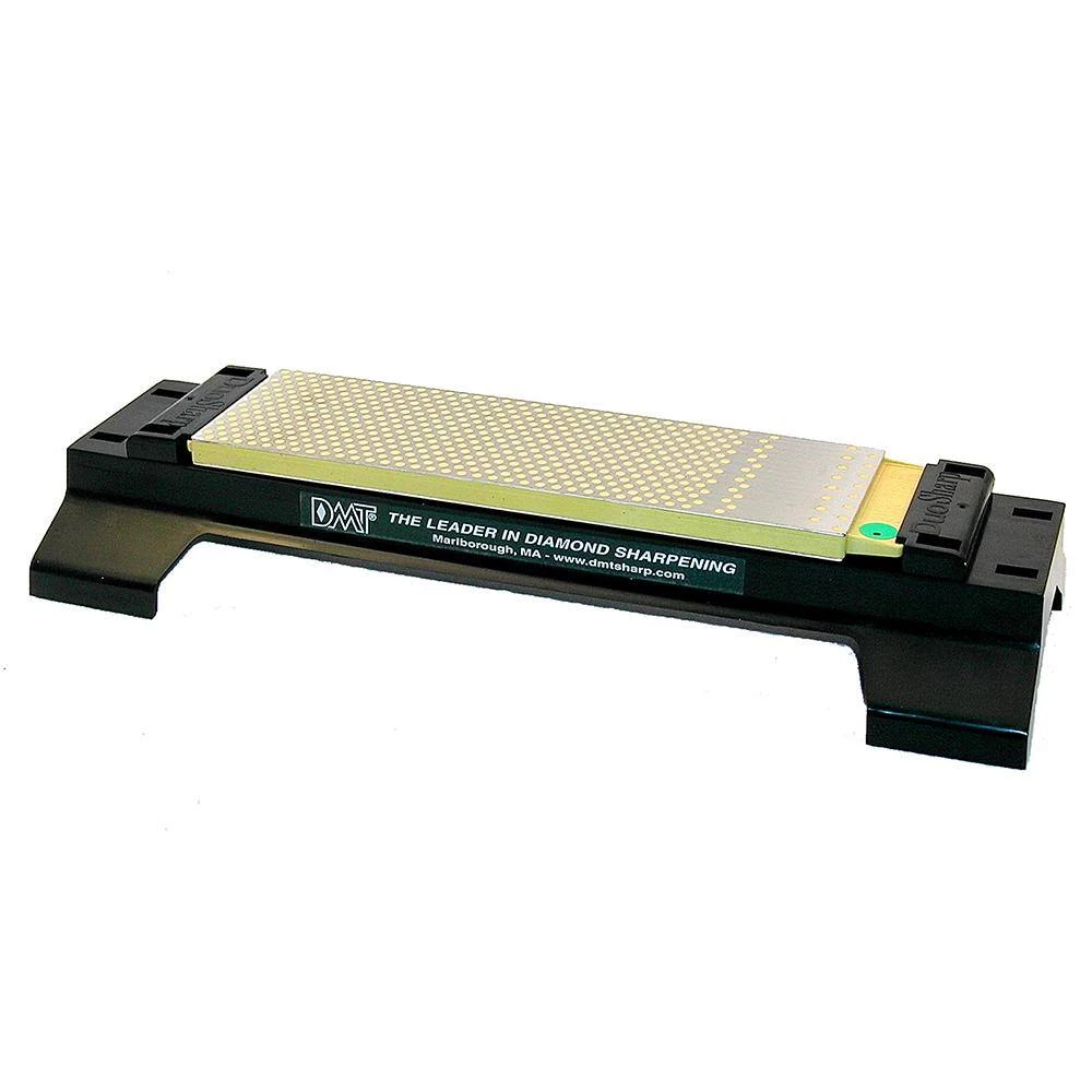 USA made 8 in. Duo Sharp plus Bench Stone with Base in extra-fine and fine diamond has a sharpening surface of 8 in. x 2-5/8 in. x 3/8 in. featuring DMT’s signature polka dot surface and a convenient continuous diamond zone that makes easy work out of small or pointed tools. The large diamond surface sharpens virtually any knife or edged tool, including kitchen knives, wood carving tools, hunting knives, chisels and much more. Easy to use, you can forget the messy oils that are required with other sharpeners; the diamond surface allows you to sharpen dry or with water. This innovative, multi-patented stone in a convenient dual-sided design is engineered precision flat, essential in assuring even sharpening and will remain flat, unlike water stones. DMT employs a proprietary process resulting in a micronized monocrystalline diamond that covers evenly across the stone for a hardwearing surface guaranteed to provide consistent, efficient sharpening for years to come. Enjoy faster sharpening: 5 or 6 strokes per edge versus 30 on a conventional abrasive. This allows you to spend less time sharpening edges and more time using them. Sharpen with fine (25 micron/600 mesh) for a keen edge and finish with extra-fine (9 micron/1200 mesh) to achieve a refined edge. The bench stone may be used alone, but the bench stone base provides 2 in. knuckle clearance, rubber feet to secure the base and a convenient handle on the underside for moving the stone over a large work piece.