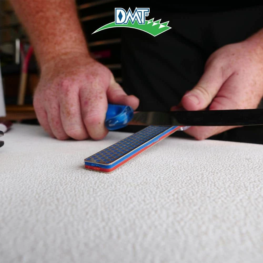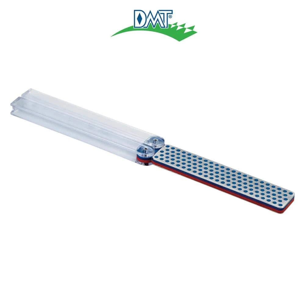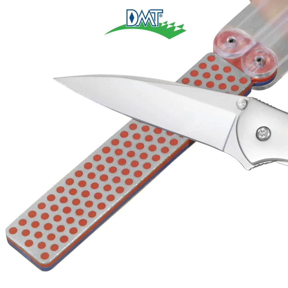 USA made Double Sided Diafold Sharpener in fine and coarse diamond offers 2-stage sharpening with compact convenience. Two 4-1/3 in. x 7/8 in. x 1/4 in. Diamond Whetstone sharpeners combined to create a lightweight sharpener that is great for home, camper, tool box, gardening shed and more. In use, the sharpener is 9-1/2 inches long; the folding plastic handles protect the sharpener when not in use and reduce it’s size to 5 inches for safe storage anywhere. Easy to use, you can forget those messy oils that are required with other sharpeners; the diamond surface allows you to sharpen dry or with water. DMT employs a proprietary process resulting in a micronized monocrystalline diamond that covers evenly across the stone for a hardwearing surface guaranteed to provide consistent, efficient sharpening for years to come. DMT’s signature polka dot pattern provides for slightly recessed holes to collect the metal fines removed during sharpening to prevent loading. Enjoy faster sharpening: 5 or 6 strokes per edge versus 30 on a conventional abrasive. This allows you to spend less time sharpening edges and more time using them. Sharpen with coarse diamond (45 micron / 325) to restore a neglected edge quickly and finish with fine diamond (25 micron / 600 mesh) for a razor sharp edge.