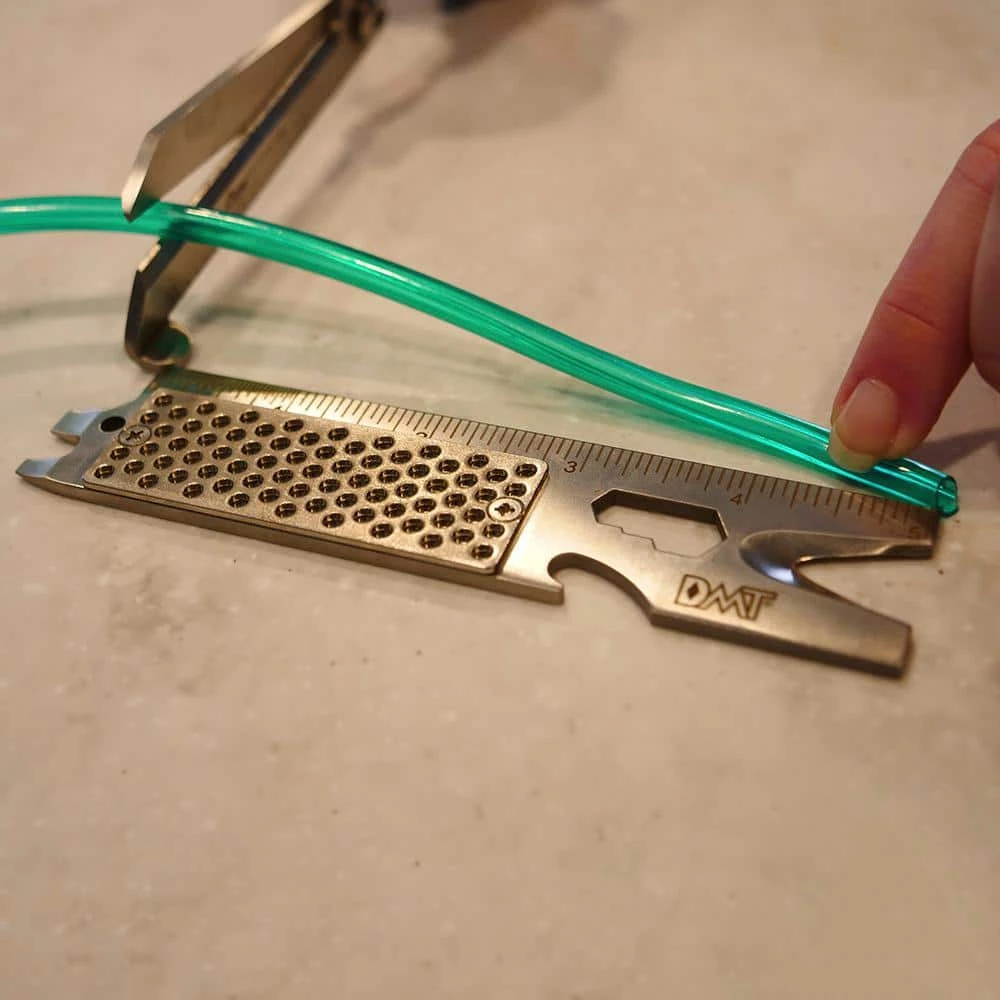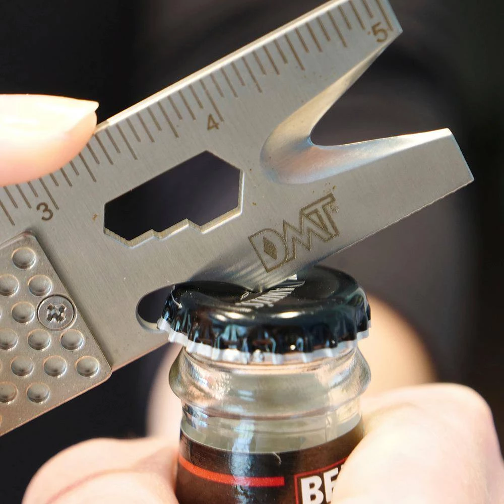 - 2 flat head screwdrivers, bottle opener, wire stripped, file edge and metric-English ruler