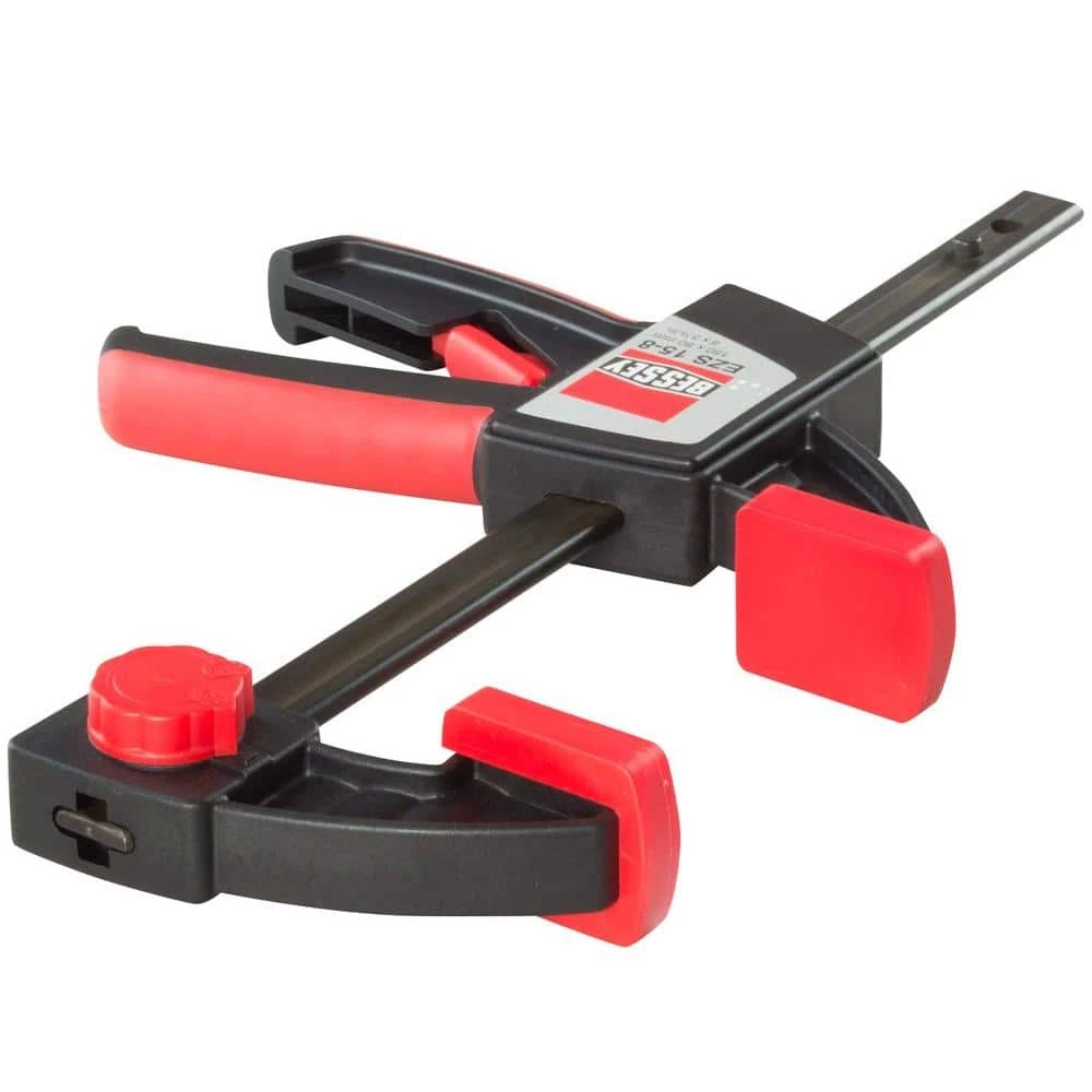 The BESSEY EZS Series offers a revitalized approach to 1 hand clamps. What separates it from the rest is that it has been engineered from the start to offer a clean design, comfortable handles, 445 lbs. of potential clamping force and the ability to quickly transform from clamping to spreading. The transition from clamping to spreading requires no tools. All that is required is a quick twist of the locking knob to disengage the fixed jaw, move it to the opposite end of the rail and a 2nd quick twist to lock it in place.