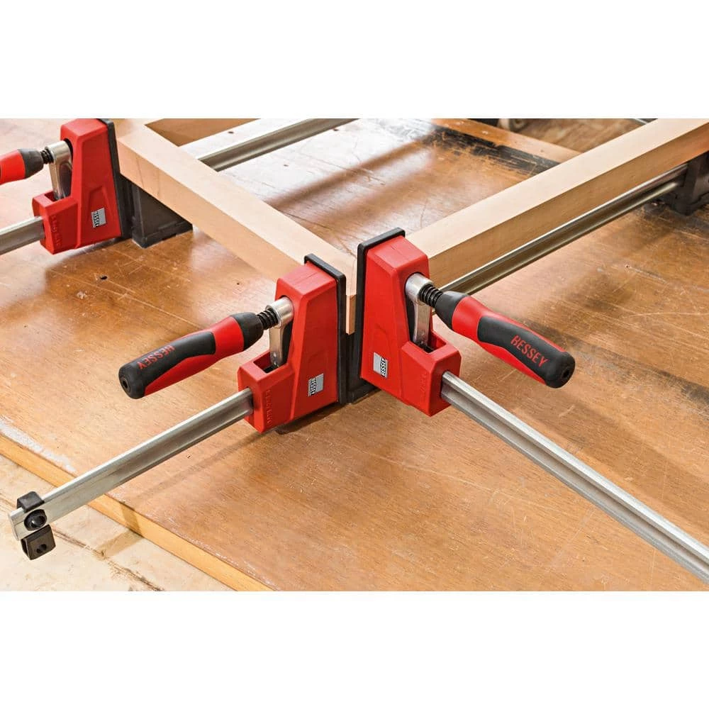 The BESSEY K-Body REVO has large parallel jaws designed to clamp at a nominal 90°. The K-Body REVO is rated at 1700 lbs. of clamping force and has a 3-3/4 in. throat depth. Also included as standard parts are 3 glue-resistant removable jaw pads, 2 rail protection pads and an end clip that helps to balance the clamp during glue-ups. The end clip and the rail protection pads have through holes for use with optional TK-6 hold-down clamps to temporarily affix the clamp to a workbench or other surface up to 2 in. thick. An ergonomic composite handle for better comfort and grip comes standard. Other accessories are available. All figures used for reference are nominal and not precise indicators.
