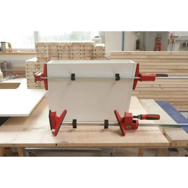The BESSEY K-Body REVO has large parallel jaws designed to clamp at a nominal 90°. The K-Body REVO is rated at 1700 lbs. of clamping force and has a 3-3/4 in. throat depth. Also included as standard parts are 3 glue-resistant removable jaw pads, 2 rail protection pads and an end clip that helps to balance the clamp during glue-ups. The end clip and the rail protection pads have through holes for use with optional TK-6 hold-down clamps to temporarily affix the clamp to a workbench or other surface up to 2 in. thick. An ergonomic composite handle for better comfort and grip comes standard. Other accessories are available. All figures used for reference are nominal and not precise indicators.
