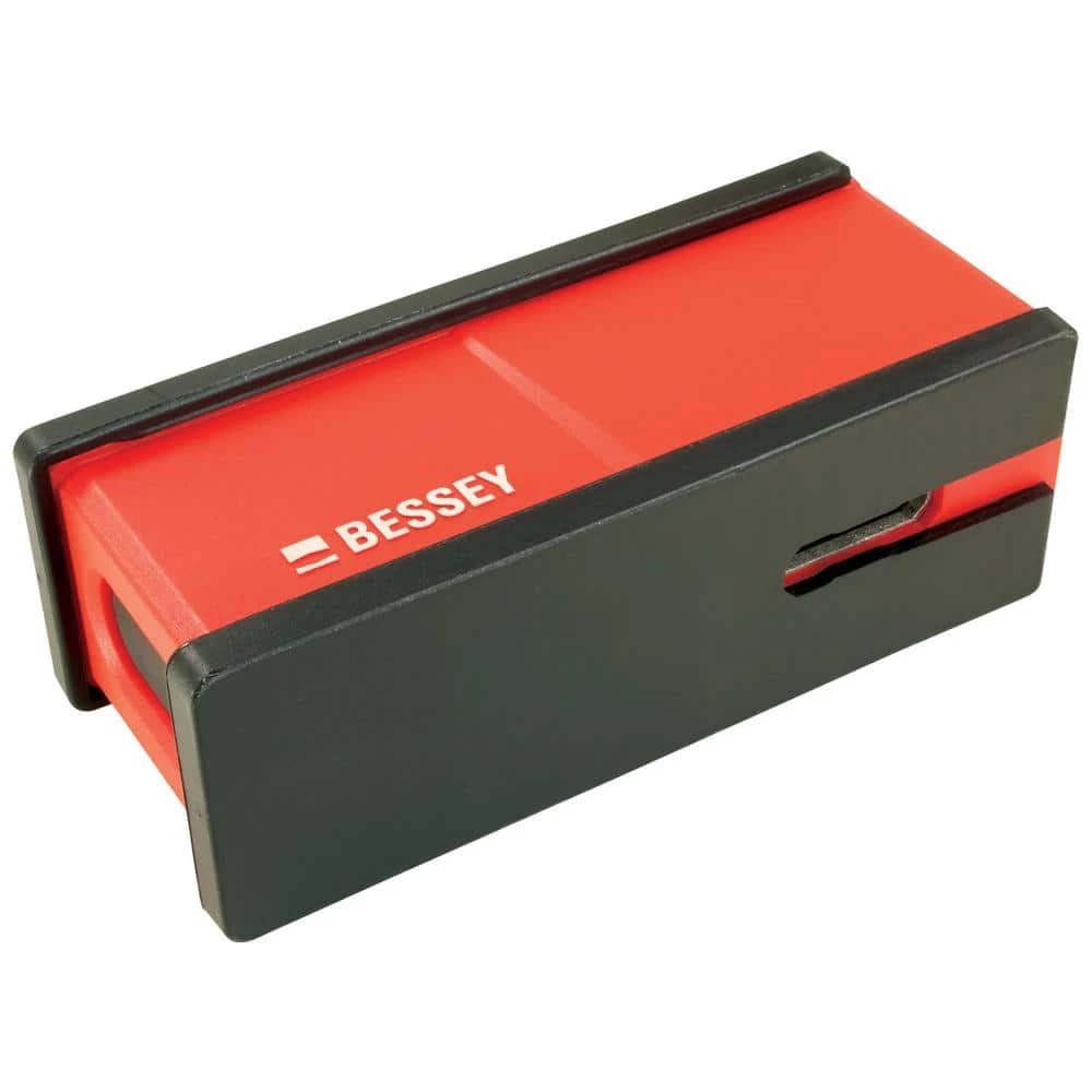 The BESSEY K-Body REVO has large parallel jaws designed to clamp at a nominal 90°. The K-Body REVO is rated at 1700 lbs. of clamping force and has a 3-3/4 in. throat depth. Also included as standard parts are 3 glue-resistant removable jaw pads, 2 rail protection pads and an end clip that helps to balance the clamp during glue-ups. The end clip and the rail protection pads have through holes for use with optional TK-6 hold-down clamps to temporarily affix the clamp to a workbench or other surface up to 2 in. thick. An ergonomic composite handle for better comfort and grip comes standard. Other accessories are available. All figures used for reference are nominal and not precise indicators.