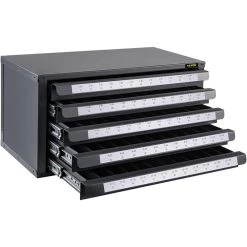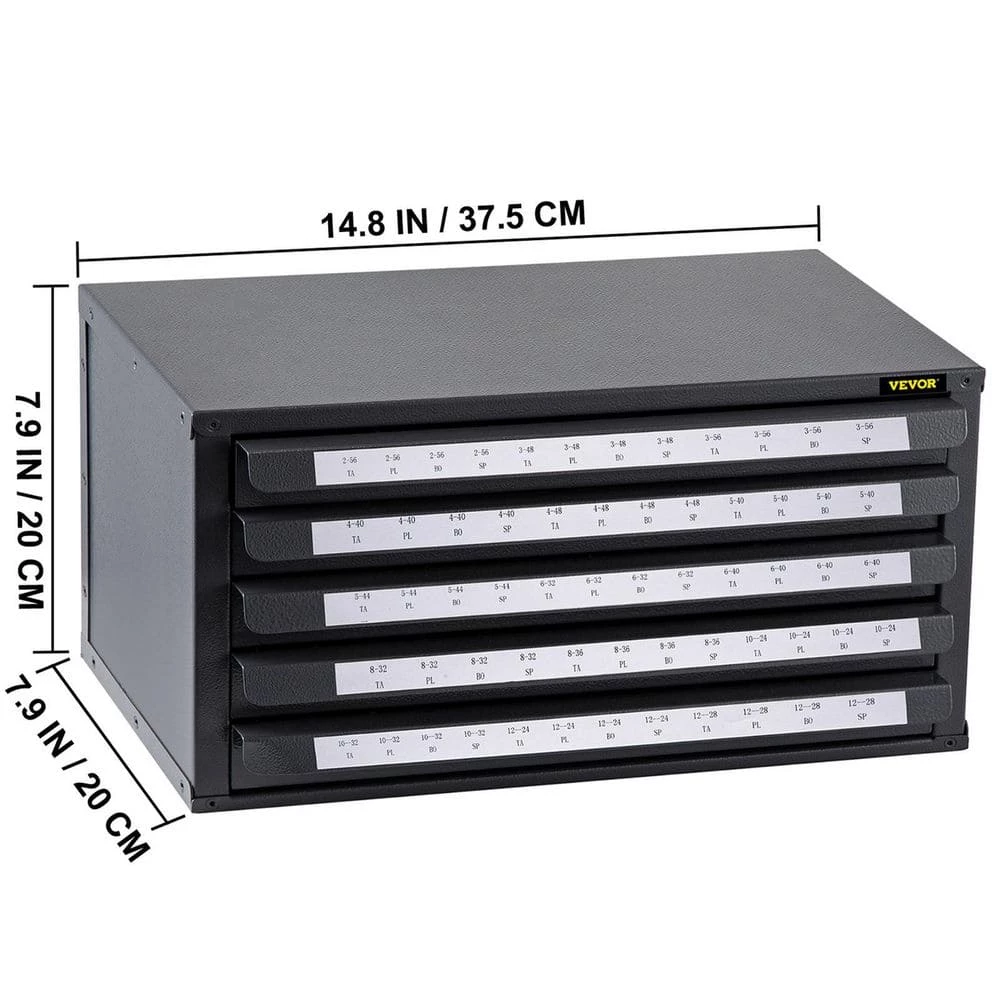 VEVOR 5-Drawer Tap Dispenser Cabinet #2-56 to #12-28 Size and 60 Compartments and Clear Labels. Our VEVOR 5-drawer tap organizer is ideal for machine shops, maintenance departments and general storage. It holds multiple tapers, plug, bottoming and spiral point taps in metric sizes from #2 to 56 to #12 to 28 and has 60 compartments. The classified storage labeled compartments provide quick identification. This dispenser is the perfect solution to keep your tools neat and organized. Get ready to know every single tap of your new cabinet.